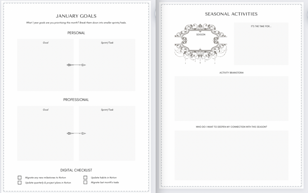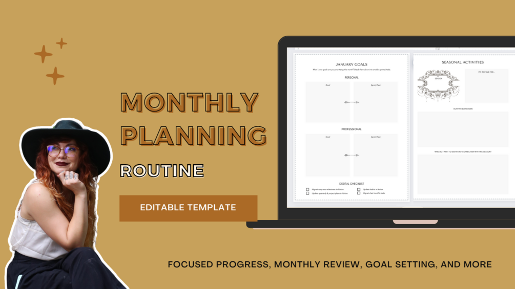 Want an easy monthly planning system for keeping personal and professional goals front of mind? This editable, printable template allows you to plan your month while staying intentional about your wellbeing. It includes space for your long and short-term goals, project-planing, seasonal activities, intention setting, end-of-month reflection, and more.